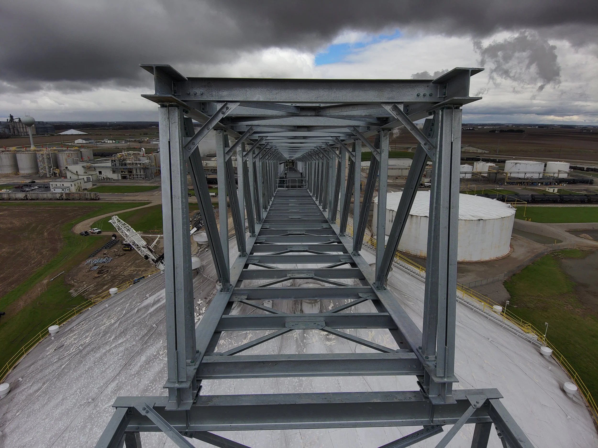 Bucket elevator tower and conveyor box truss addition Bucket elevator tower with switchback stairway and catwalk replacement Long span box truss with belt conveyor
